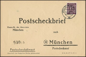 15 Pfg. lila bzw. grün, zwei seltene Einzelfrankaturen auf Bedarfs-Postscheckbriefen