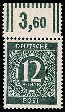 12 Pfg. dunkelgrüngrau, seltene Farbe, als postfrisches Walzendruck-Oberrandstück, Fotoexp. Bernhöft. Mi. 2500,-
