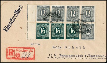 20 Pfg. im 12er-Block als 10-fach-Mehrfach-Frankatur auf Brief aus Langenwang, 22.6.48, sign. Schlegel