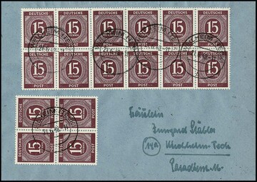 15 Pfg. per 16 in Blockeinheiten als gute 10-fach-Mehrfach-Frankatur auf Brief aus Weilheim, 21.6.48