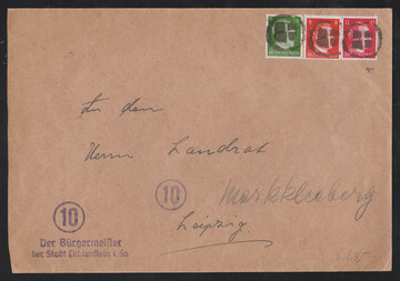 "Lichtenstein", 5, 8 und 12 Pfg. Hitler auf Bürgermeister-Couvert aus Lichtenstein, Marken übergehend mit Kork-Stempel mit vier Quadraten entwertet, sign. Zirkenbach