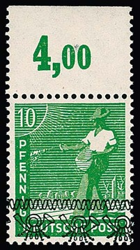 10 Pfg. Arbeiter-Bandaufdruck als postfrisches Plattendruck-Oberrandstück, durchgezähnt, Mi. 750,-, sign. Becker