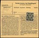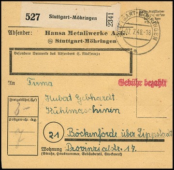 30 Pfg. Ziffern-Netzaufdruck, fünf meist verschiedene Einzelfrankaturen: auf zwei Auslandskarten ins Saarland bzw. in die CSSR, auf Streifband der 4. Gewichtsstufe (selten!), auf Überseebrief, sowie als Lagergebühr auf "Gebühr bezahlt"-Paketkarte (sehr seltene Variante!) in den Landbezirk nach Lippstadt