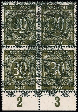 30 Pfg. Ziffern-Netzaufdruck im seltenen Plattendruck-Unterrand-Viererblock gestempelt. Attest H.D. Schlegel "einwandfrei". Mi. nur für die beiden Plattendruck-Unterrandstücke ca. 1400,-