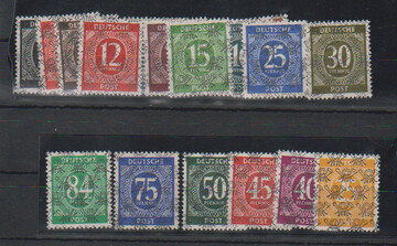 Ziffern-Band-/Netzaufdrucke, acht bessere Belege: Nr. 54I nebst Nr. 48I, 38II u. 42II; 57II nebst 43II u. 45I; 58I nebst 36I/II, 58I, 66I; 62I nebst 41II, 43-44I; 63I, 66I u. 36I(2); 65I nebst 37I, 38II, 39I u. 41II; 65II u. 81; sowie seltene Portostufe mit 65-66II, 36I, 41I, 73 u. 77 (sign. Schlegel)