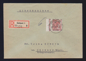 60 Pfg. Arbeiter, sog. "helle 60er", mit Netzaufdruck vom linken Rand, auf R-Brief aus Stuttgart