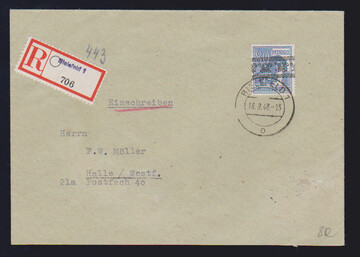 80 Pfg. Arbeiter-Bandaufdruck als EF auf R-Doppelbrief aus Bielefeld, 18.9.48