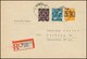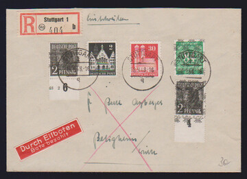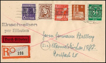 84 Pfg. Ziffern mit doppeltem Bandaufdruck, nebst weiterer Frankatur, u.a. 6 Pfg. Arbeiter mit kopfstehendem Bandaufdruck, auf portoger. Orts-R-Expreßbrief aus Wermelskirchen, Attest Schlegel. Mi. 450,- +