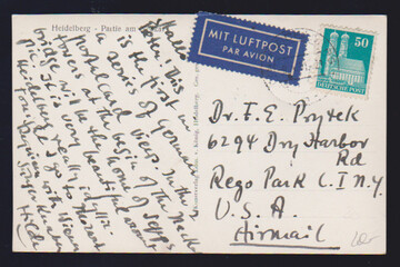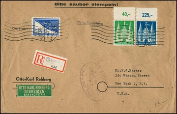 50 Pfg. Bauten wg als EF auf Lupo-Überseebrief in die USA, sowie 50 Pfg. eg im Paar als MeF auf R-Brief gg. Rsch. mit Weitersendung (an den damaligen Bundesverkehrsminister Seebohm)