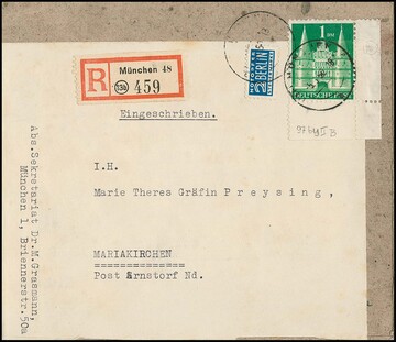 1 DM Bauten, "hohe Treppe", rechte untere Bogenecke als EF auf Adreßteil einer R-Päckchen-Adresse ab München (Kaufpreis 2003 = 468,- Euro)