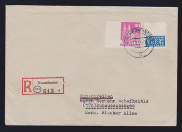 90 Pfg. Bauten, linkes Randstück, links ungezähnt (Bug nur im Rand) auf Sammler-R-Brief aus Neumünster 1951
