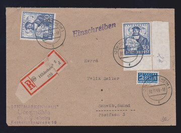 30 Pfg. Exportmesse per zwei, dabei rechte untere Bogenecke, als MeF auf R-Brief aus Hildesheim