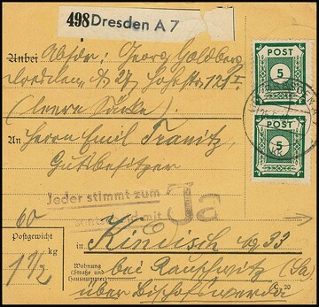 5 Pfg. grün per 12 vs./rs. als hohe Mehrfach-Frankatur auf Bedarfs-Paketkarte ab Dresden, 26.10.46, diese mit Propagandastempel ("Jeder stimmt zum Volksentscheid mit JA")