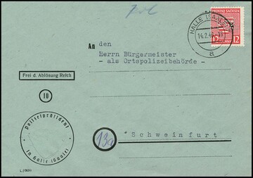 12 Pfg. Wappen mit "POL"-Lochung als EF auf sauberem Bedarfsbrief von Halle/S., 14.2.46. "POL"-Lochungen in der SBZ gab es nur von Halle und entspr. Belege sind äusserst selten!