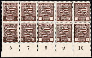 10 Pfg. siena im postfrischen Unterrand-Zehnerblock, auf Bogenfeld 100 der seltene Teilauflagen-Plattenfehler "O statt P in PFENNIG", alleine 500,- Mi., Attest Jasch