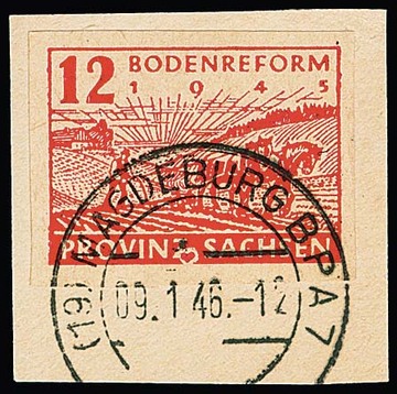 12 Pfg. Bodenreform, Versuchsdruck in schwarzrosarot gestempelt mit breitem rechtem Bogenrand, Stempel "Halle 1", sign. mit Attest Zierer. Mi. 2500,-