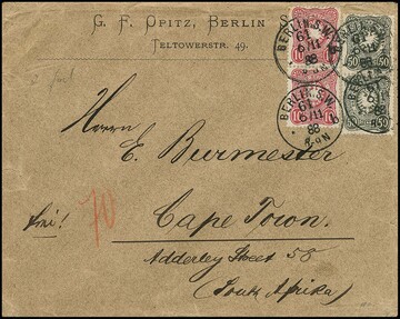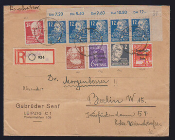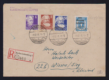 20 Pfg. mit kopfstehendem Maschinenaufdruck, nebst 6, 8 u. 50 Pfg. Köpfe, auf R-Brief ab Berlin-Lichtenberg, Mi. 200,- +