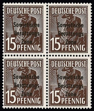 15 Pfg. in guter Farbe dunkelbraun, Maschinenaufdruck, im tadellos postfrischen Viererblock, Attest Paul. Mi. 1200,- +