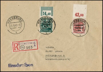 60 Pfg. rotkarmin, Plattendruck-Oberrandstück, ndgz, nebst 16 Pfg. mit Walzendruck-Oberrand, auf portogerechtem Orts-R-Brief aus Merseburg. Die "helle 60er" ist als Oberrandstück auf Brief sehr selten (schon lose gest. im Michel nur mit "-.-" bewertet). Attest Paul