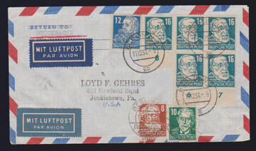 8 (bereits mit Eckfehler verklebt), 10, 12 und fünfmal 16 Pfg. Köpfe (ein Unterrand-Viererblock) auf portoger. Lupo-Übersee-Drucksache ab Berlin 1951 in die USA, seltene Portostufe!