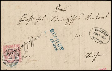 3 Kr. rosa (ein kurzer Zahn links) einzeln auf Brief mit blauem NS "20" und L2 "Buchen", sowie Postablage-Nebenstempel "Buchen-Mudau" aus dem eigenen Landbezirk nach Buchen, ex de Cock, Fotoexp. Stegmüller. Dazu gleicher blauer NS auf Fernbrief 3 Kr. sowie auf zwei Briefstücken 3 und 6 Kr., ex Slg. Erivan Haub