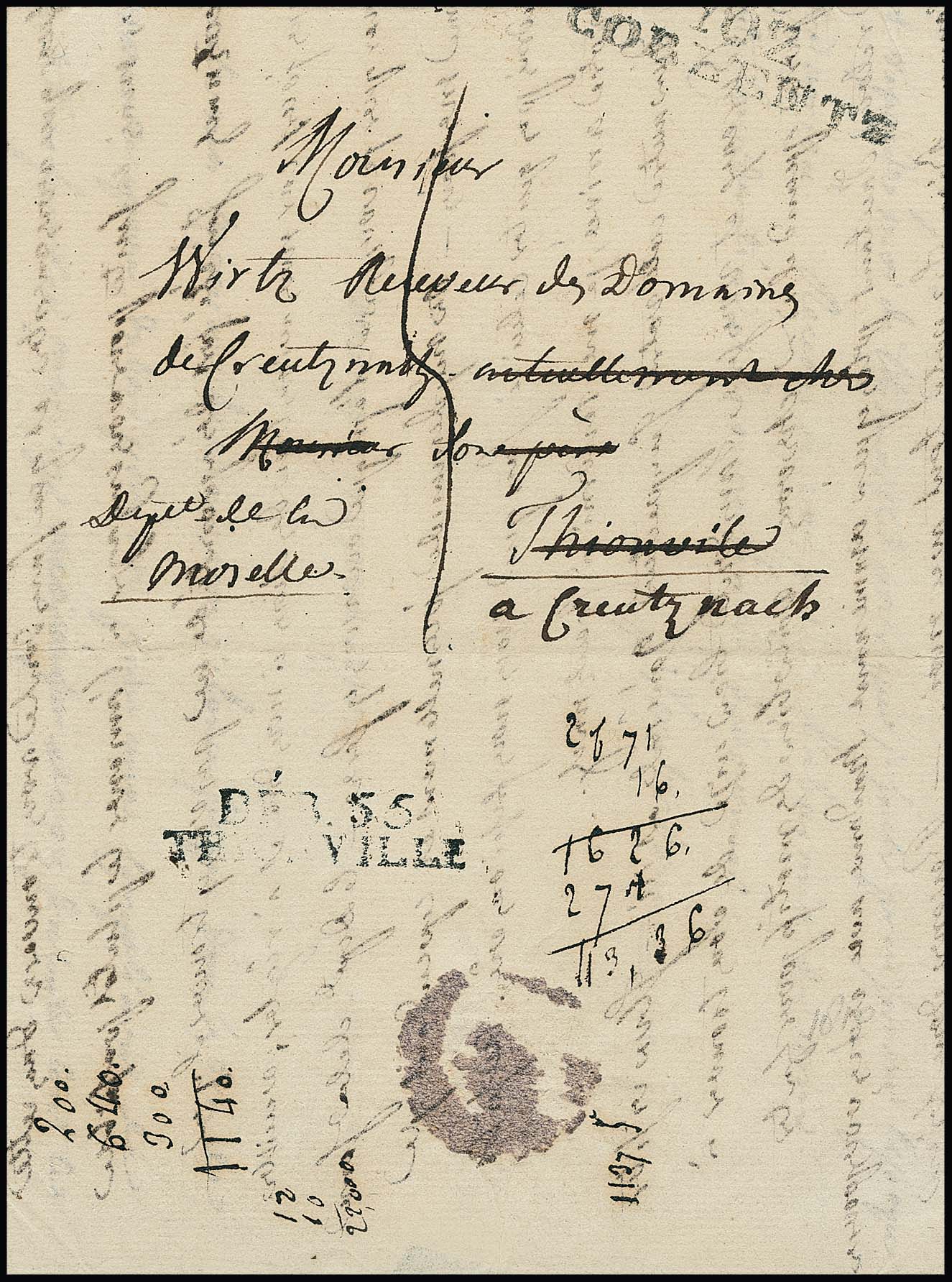"Thionville", 1810, seltener schwarzer Deboursé-L2 "DÉB 55 THIONVILLE" rückseitig auf Brief aus Coblenz (L2 "102 COBLENTZ") nach Thionville und weiter nach Creuznach