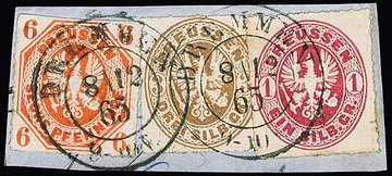 1/4 Gr. violett, ein unbedeutend verkürzter Zahn, in seltener wertgleicher Mischfrankatur mit 1/4 Gr. violett, großes Schild, auf sehr sauberer Postkarte mit Ra3 "Leipzig P.E. Nr. V. Lindenau", interessanterweise war die 1/4 Gr. großes Schild schon einmal auf einem anderen Ganzstück platziert