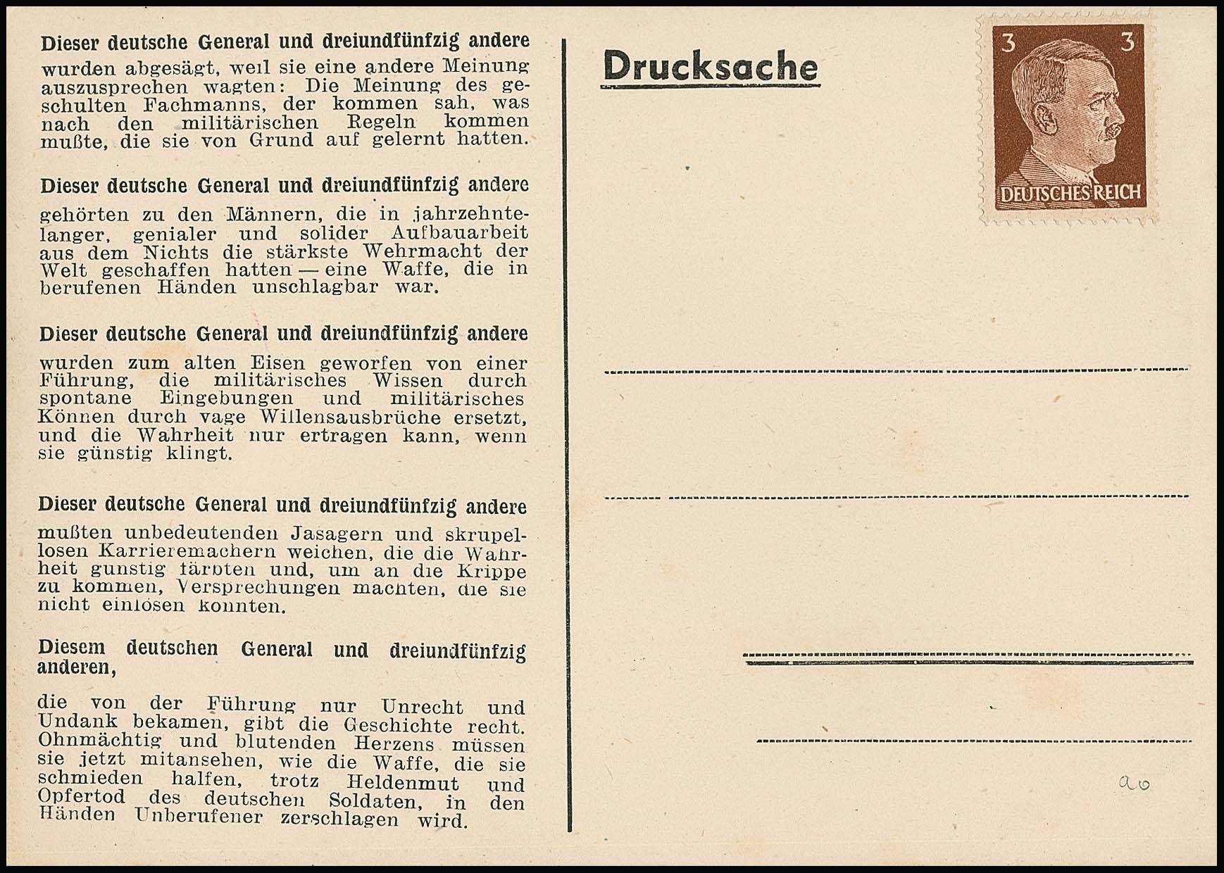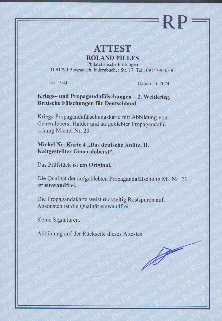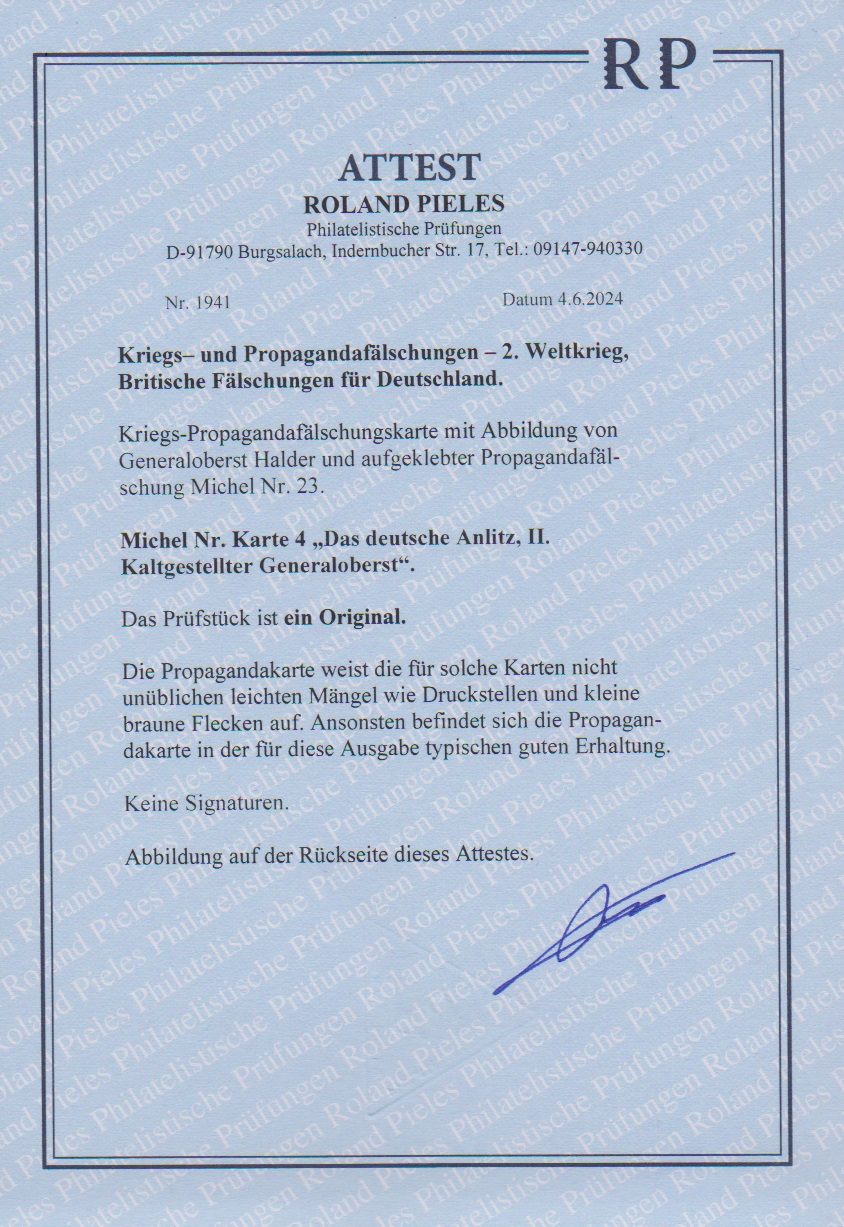 3 Pfg. Hitler, Britische Propagandafälschung für Deutschland, auf Propagandakarte mit Abb. Generaloberst Halder in hierfür typischer Erhaltung, Mi. 450,-, seltene Karte, Attest Pieles