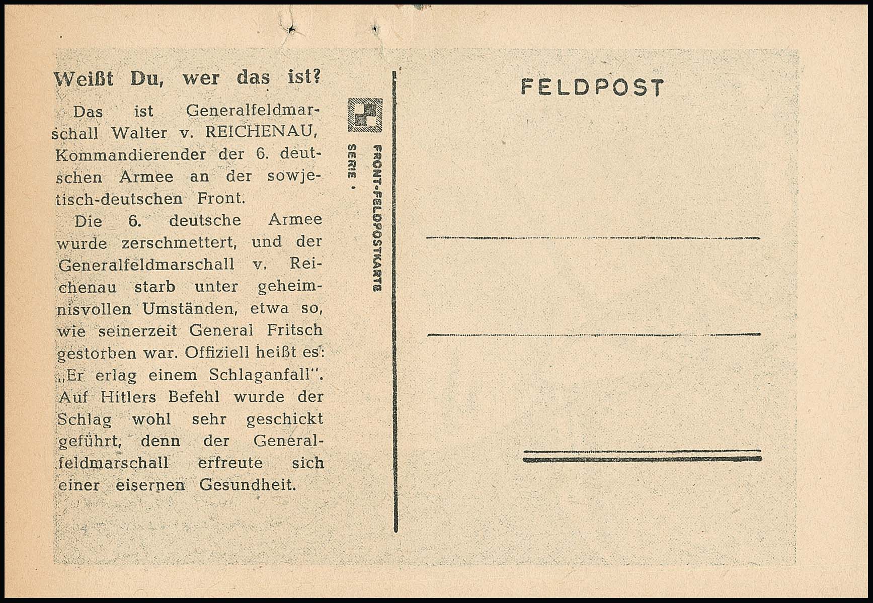 Sowjetische Fälschung für Deutschland, Propagandafälschungskarte mit Abb. Generalfeldmarschall von Reichenau tadellos ungebraucht ohne die sonst üblichen abwurf- und auffinde-bedingten Mängel mit typischen Befestigungspunkten. Attest Pieles "einwandfrei", in dieser Erhaltung selten! Mi. 1700,-