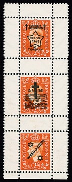 Deutsche Fälschungen für Großbritannien, 3 P. Georg, Aufdrucke "World-Capitalism", sowie "World-Judaism" und "The Bluff Charta" je zweimal, alle zusammen innerhalb eines Fünfer-Zusammendruckblocks. Die Auflage betrug nur je 30 Serien, so dass eine derartige Einheit zu den großen Seltenheiten des Sammelgebietes gehört! Attest Pieles (Mi. lose 3100,- ++)
