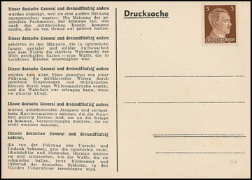 Britische Propagandafälschung für Deutschland, 3 Pfg. Hitler auf Karte "Kaltgestellter Generaloberst" Halder, diese adress-seitig unbedeutende Rostklammerspur. Mi. 450,-, Attest Pieles