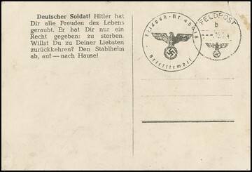 Sowjetrussische Fälschung für Deutschland, Kriegspropaganda-Fälschungskarte "Diese glückliche Stunde" mit Abbildung einer Akkordeon-Spielerin und eines Mannes im Wald. Die Karte weist abwurfbedingte Qualitätseinschränkungen auf, die hierfür typisch sind. Nur wenige Exemplare bekannt, Attest Pieles. Mi. 1700,-