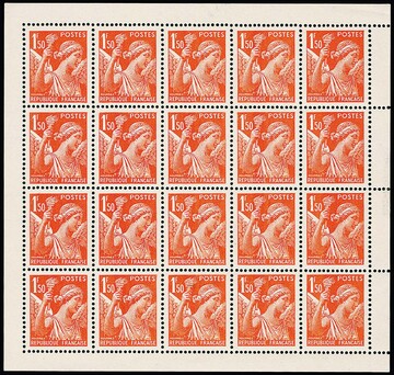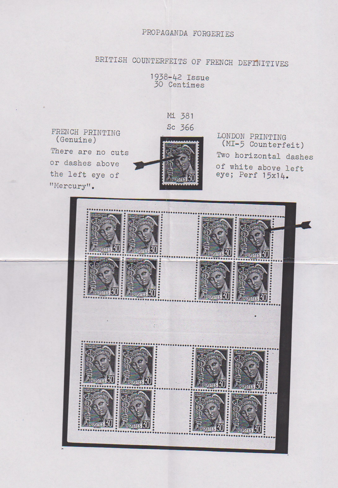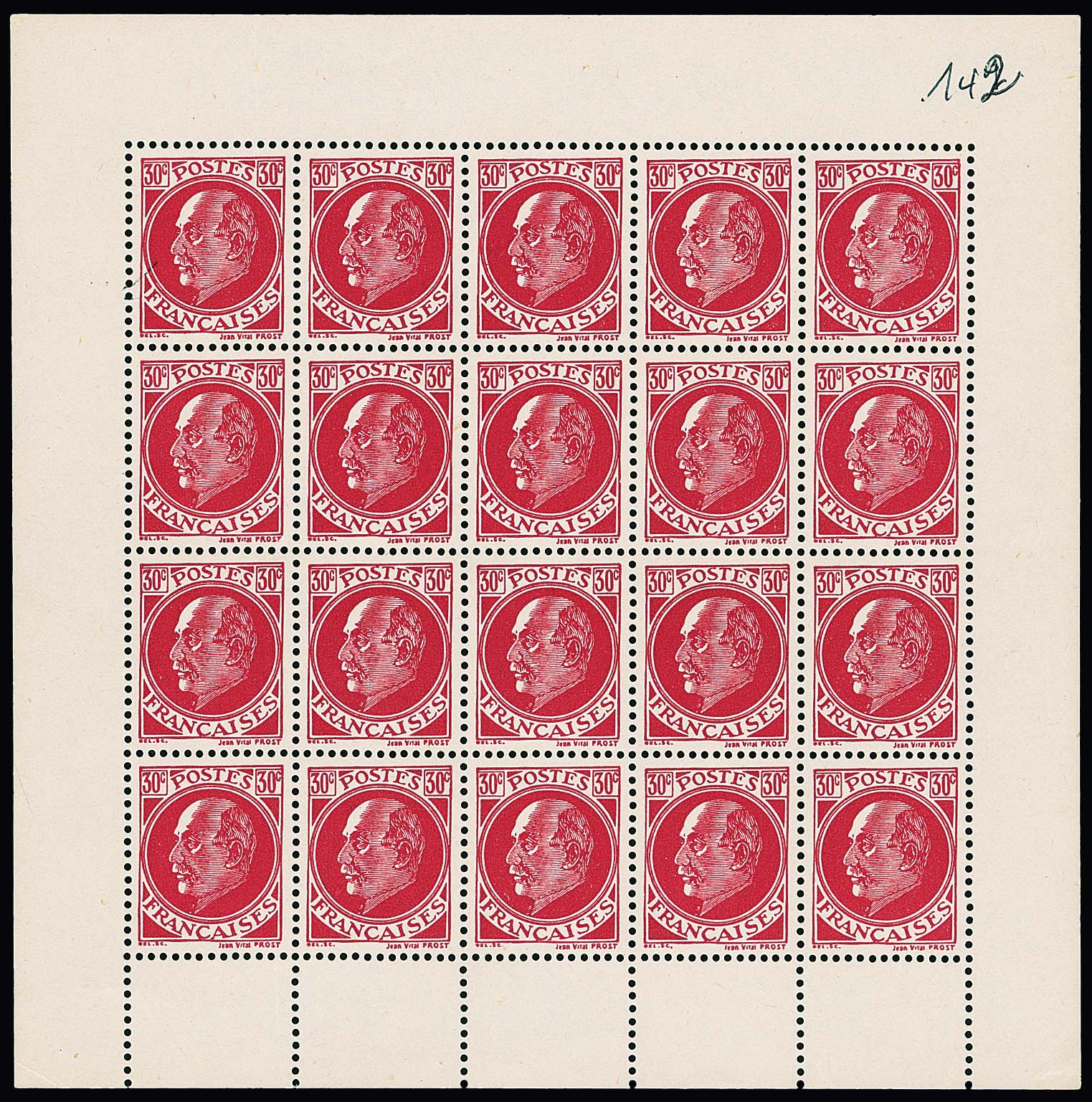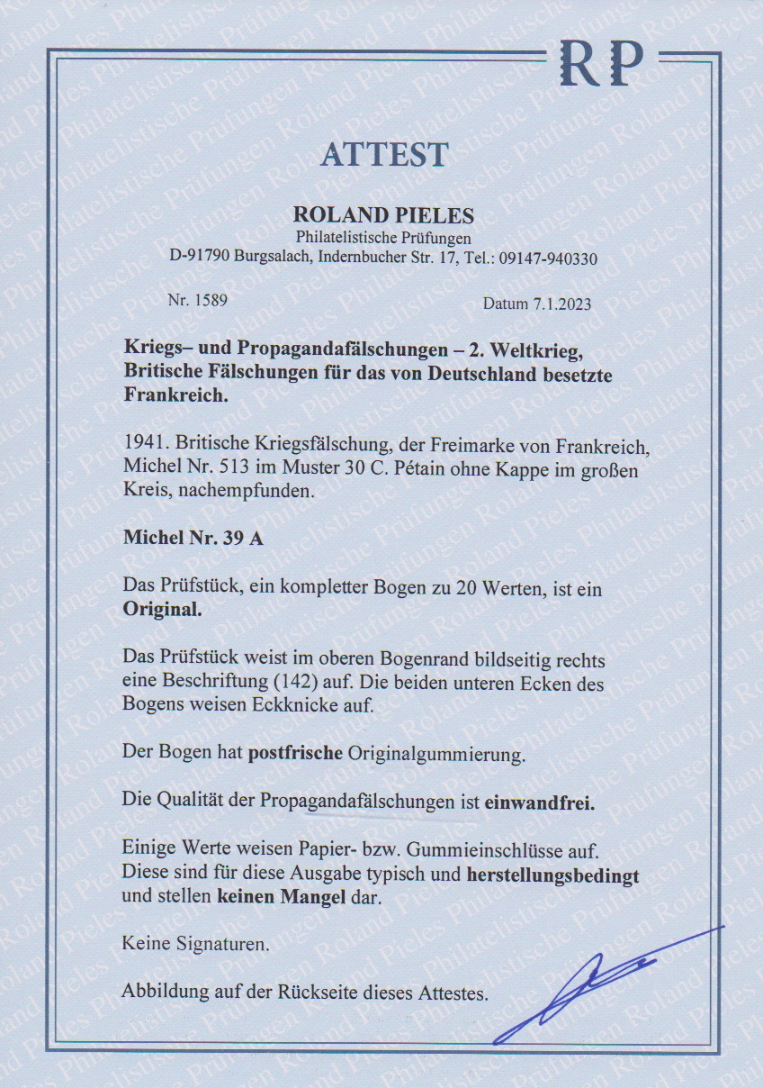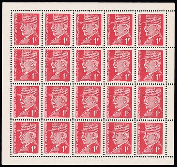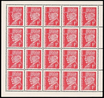 Britische Fälschung für das von Deutschland besetzte Frankreich, 1 Fr. Petain, gezähnt, im kompletten postfrischen Bogen zu 20 Exemplaren (Rand Falzreste), Mi. lose Marken 2000,-, Attest Pieles "einwandfrei"