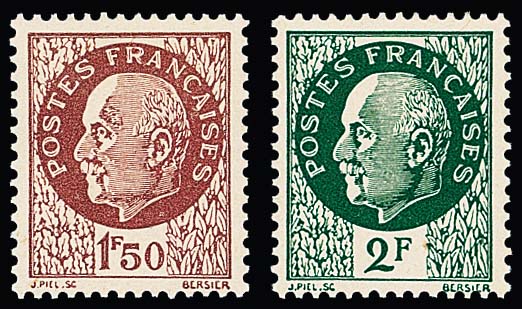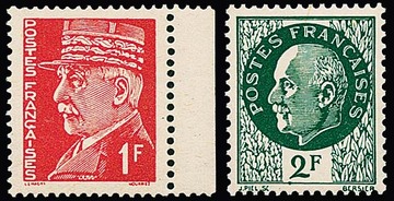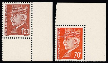 Britische Fälschungen für das von Deutschland besetzte Frankreich, Petain 30, 50 u. 70 C. (Bogenecke re.o.), sowie 1,20 Fr. (Bogenecke),1,50 u. 2 Fr. je postfrisch, alle Fotoexp. Pieles. Mi. 800,- +