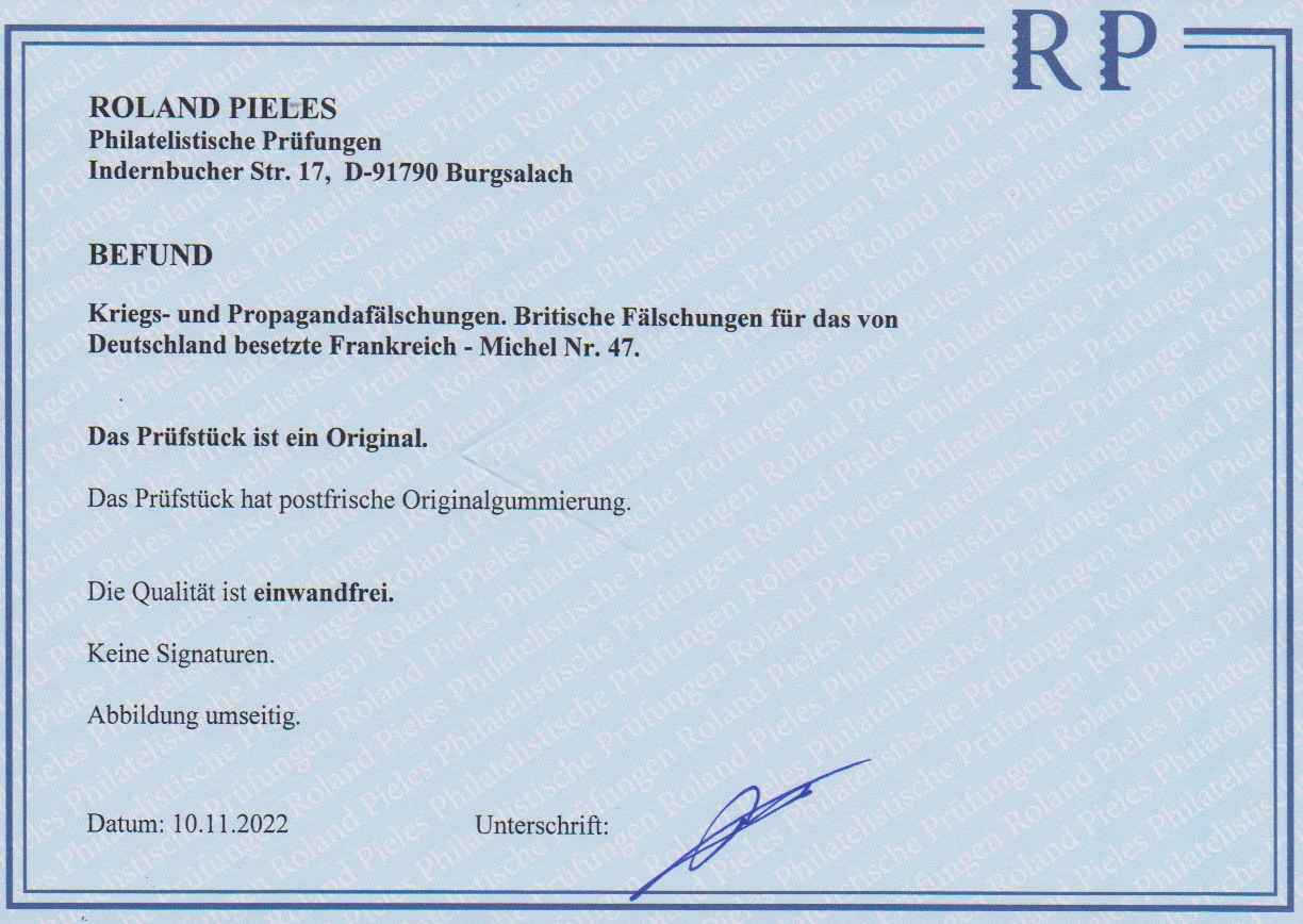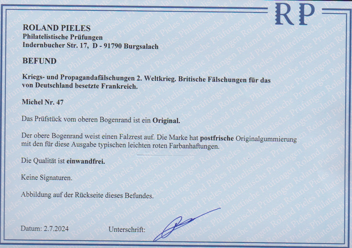 Britische Fälschungen für das von Deutschland besetzte Frankreich, 1 Fr. Petain im vollständigen postfrischen Bogen, Attest Pieles. Mi. lose 2000,- +