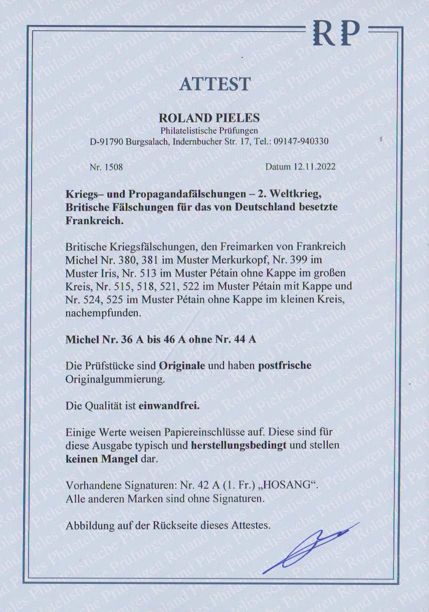 Britische Fälschungen für das von Deutschland besetzte Frankreich, beide Serien (wie immer ohne Nr. 44) komplett postfrisch. Mi. 1180,-, Attest Pieles