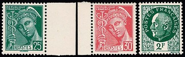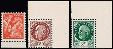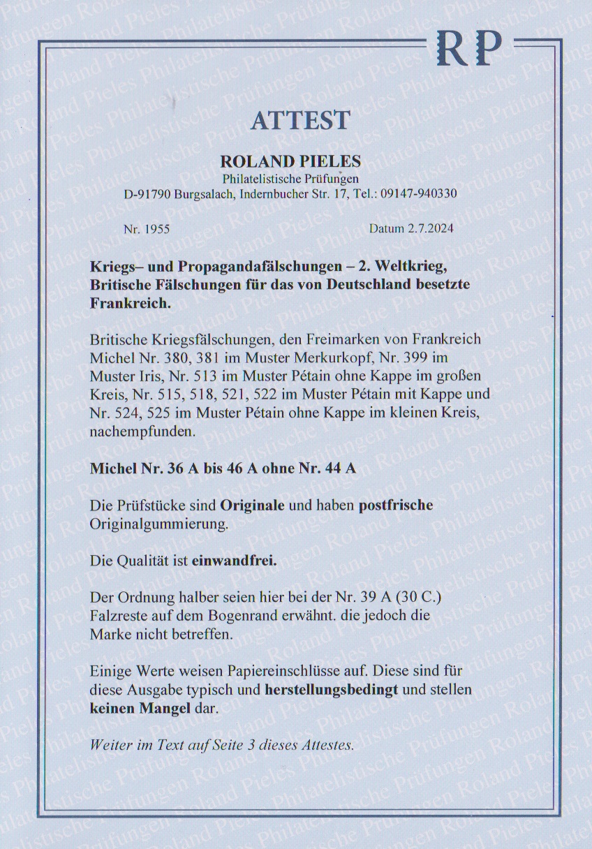 Britische Fälschungen für das von Deutschland besetzte Frankreich, drei Ausgaben (ohne die immer fehlende Nr. 44), tadellos postfrisch, meist Bogenecken. Mi. 1340,-, je Atteste Pieles