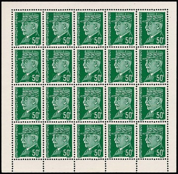 Britische Fälschung für das von Deutschland besetzte Frankreich, 50 C. Petain, gezähnt, im kompletten postfrischen Bogen. Mi. lose 2000,-, Attest Pieles "einwandfrei"