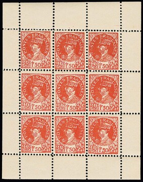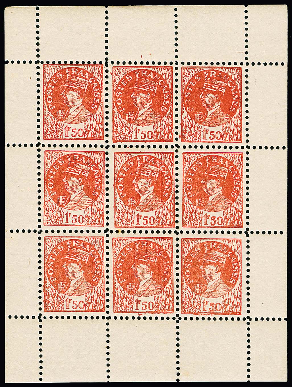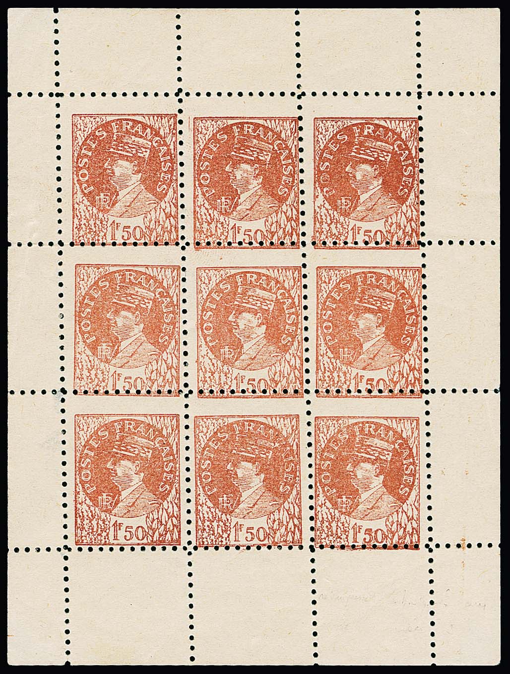 Fälschungen französischer Widerstandsorganisationen für das von Deutschland besetzte Frankreich,1,50 Fr. rotbraun, sog. "Nizza-Fälschung" mit Abb. Charles de Gaulle im kpl. postfrischen Kleinbogen (lediglich im Rand kleine Haftspuren bzw. dünne Stellen), Mi. 900,-
