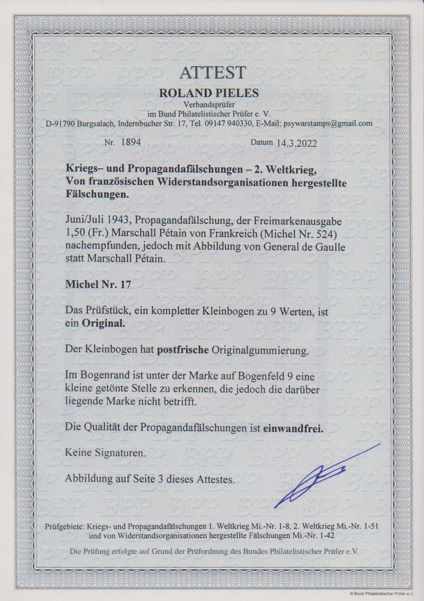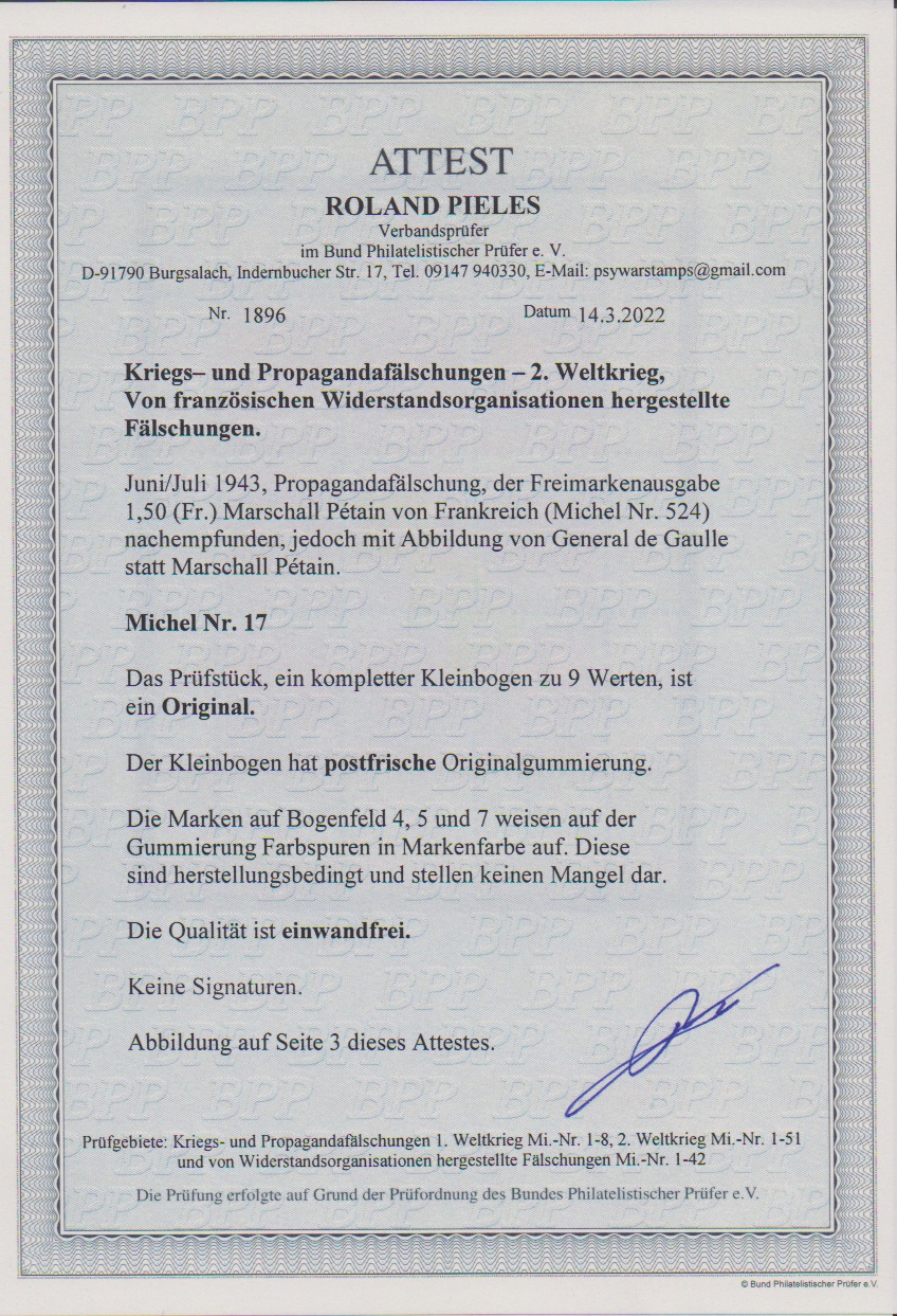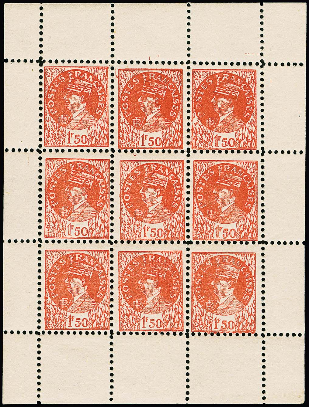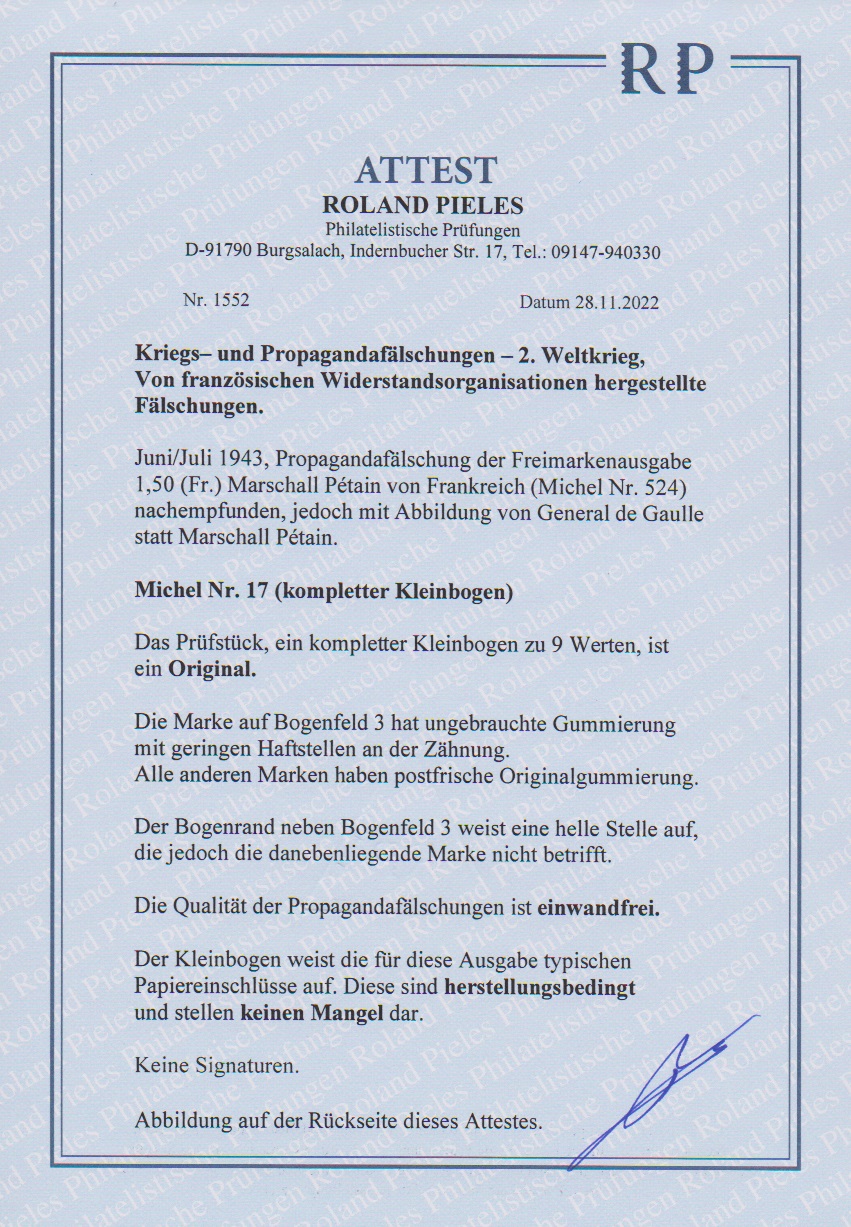 Fälschungen von Widerstands-Organisationen, 1,50 Fr. Petain im vollständigen postfrischen Kleinbogen zu neun Werten, im Aussenrand kl. getönte Stelle, Marken tadellos, als Bogen selten! Attest Pieles. Mi. 900,-