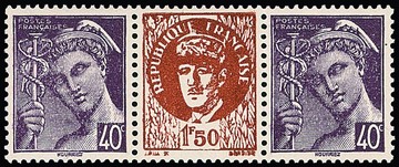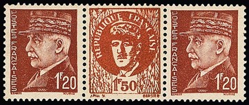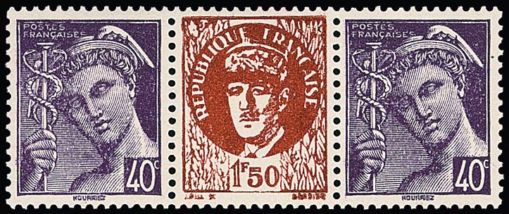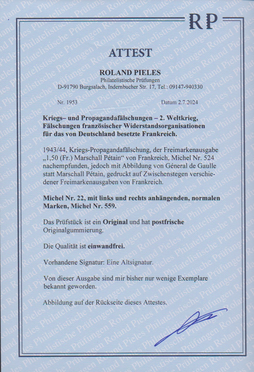 Fälschungen französischer Widerstandsorganisationen für das von Deutschland besetzte Frankreich, 1,50 Fr. Petain, jedoch mit Abbildung De Gaulle statt Petain, gedruckt auf dem Zwischensteg von Frankreich 40 C. Merkur (Nr. 559), tadellos postfrisch. Attest Pieles "einwandfrei ... mir bisher nur wenige Exemplare bekannt geworden".