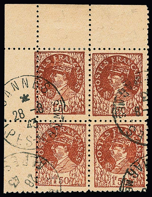Fälschungen französischer Widerstandsorganisationen für das von Deutschland besetzte Frankreich, 1,50 Fr. rotbraun, Petain, im gestempelten Viererblock aus der linken oberen Bogenecke, Mi. gest. "-.-"