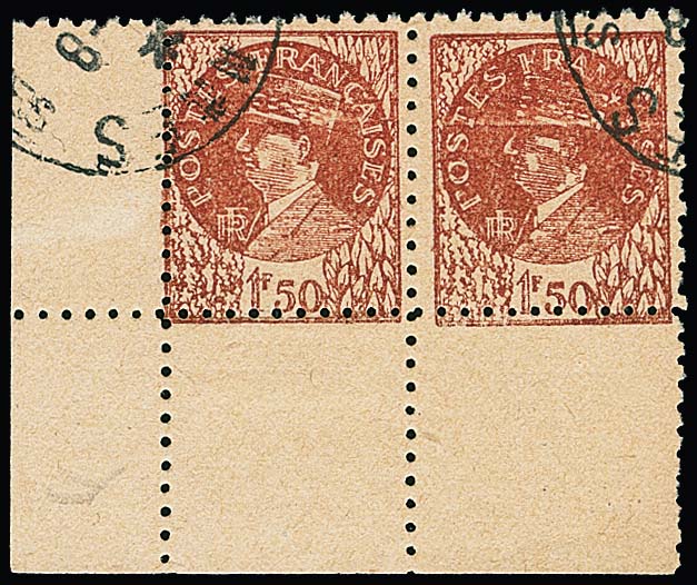Fälschungen französischer Widerstandsorganisationen für das von Deutschland besetzte Frankreich, 1,50 Fr. rotbraun, Petain, im gestempelten Paar aus der linken unteren Bogenecke, Mi. gest. "-.-"