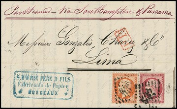 80 C. karmin (oben kleiner Spalt) in Mischfrankatur mit gezähnter Napoleon 40 C. orange auf sauberem Faltbrief mit Inhalt (Trauerbrief) von Bordeaux 1863 nach Lima/Peru, seltene Destination