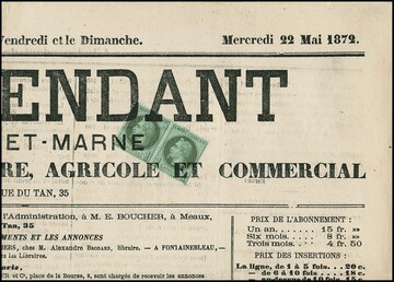 1 C. olivgrün/bläulich, Napoleon im Paar, bzw. Ceres einzeln, je auf Zeitung 1872/73 mit seltener Zeitungsdruck-Entwertung