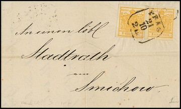 1 Kr. gelborange, Handpapier, zwei Werte (einmal winzig "eckknapp") auf gefaltetem Ortsbrief von Prag nach Smichow, Briefpapier unauffälliger Einriß
