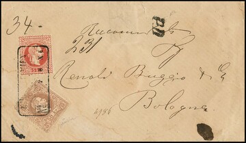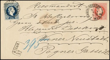 50 Kr. lilabraun, grober Druck, nebst 5 Kr. rosa, auf Einschreibecouvert (dieses oben kl. Randriß und leichte Feuchtigkeitsspuren) mit Ra3 "Mariahilf Wien Recommandirt" 1878 nach Bologna/Italien (3. Gewichtsstufe + Reco). Briefe mit der 50 Kr. sind selten! Sign. Müller und Attest Eichele "einwandfrei"