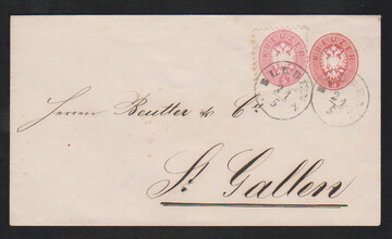 5 Kr. rosa (links leichte Zahnspitzentönung) auf Ganzsache 5 Kr. rot, mit K1 "Bludenz" zum Sonderporto nach St. Gallen/Schweiz
