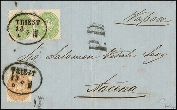 3 Kr. gelbgrün, waagerechtes Paar, nebst 15 Kr. gelbbraun, auf Kabinettbrief von Triest 1868 nach Ancona, Fotoexp. Ferchenbauer
