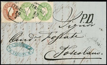 3 Kr. gelbgrün per zwei, nebst 10 Kr. rötlichbraun, auf Kabinettbrief von Triest nach Toscolano